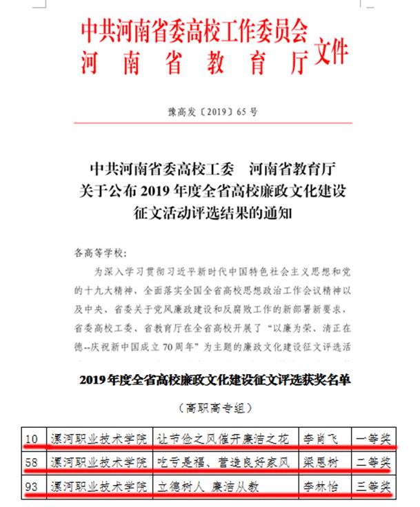 近日,中共河南省委高校工委、河南省教育厅下发《关于公布2019年度全省高校廉政文化建设征文活动评选结果的通知》(豫高发〔2019〕65号)文件,对2019年度在全省高校廉政文化建设征文评选活动中的获奖者予以表彰。我校工商管理系李肖飞撰写的《让节俭之风催开廉洁之花》荣获一等奖,监察审计处梁恩树撰写的《吃亏是福、营造良好家风》荣获二等奖、人事处李林怡撰写的《立德树人 廉洁从教》荣获三等奖。