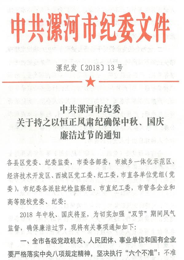 现将《中共漯河市纪委关于持之以恒正风肃纪确保中秋、国庆廉洁过节的通知》(漯纪发〔2018〕13号)转发给你们,节日期间请各部门认真贯彻落实中央八项规定精神和实施细则,切实做到廉洁自律,严格遵守廉洁自律各项规定,防止“四风”反弹,坚持不懈转变作风,树好形象。