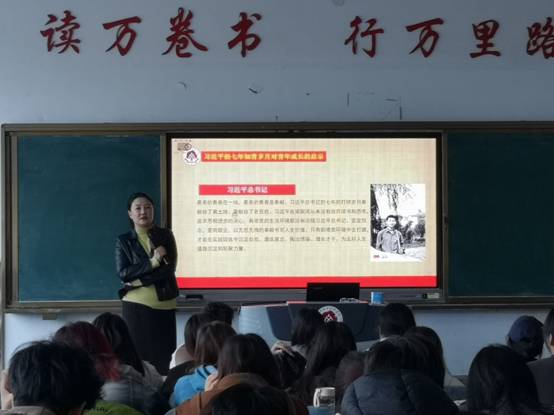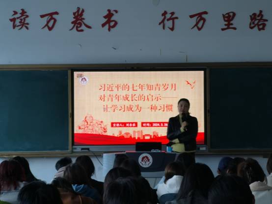 在课堂上,刘杏茹以读书分享、学习参观经历感悟的形式给同学们推荐《习近平的七年知青岁月》,鼓励大家树立终身学习的思想。她详细介绍了习近平在艰苦岁月的磨练,从习近平总书记15岁到陕西延安市延川县梁家河下乡做知青的七年时间,在物质和精神极度匮乏的环境中,闯过“五关”——跳蚤关、饮食关、生活关、劳动关、思想关。面对艰苦的环境,习近平总书记不惧怕困难,不怨天尤人,依靠勤劳和汗水开辟人生和事业前程。习近平始终把读书学习当成一种生活态度、一种工作责任、一种精神追求,这种勤奋好学的精神,贯彻总书记的人生轨迹。